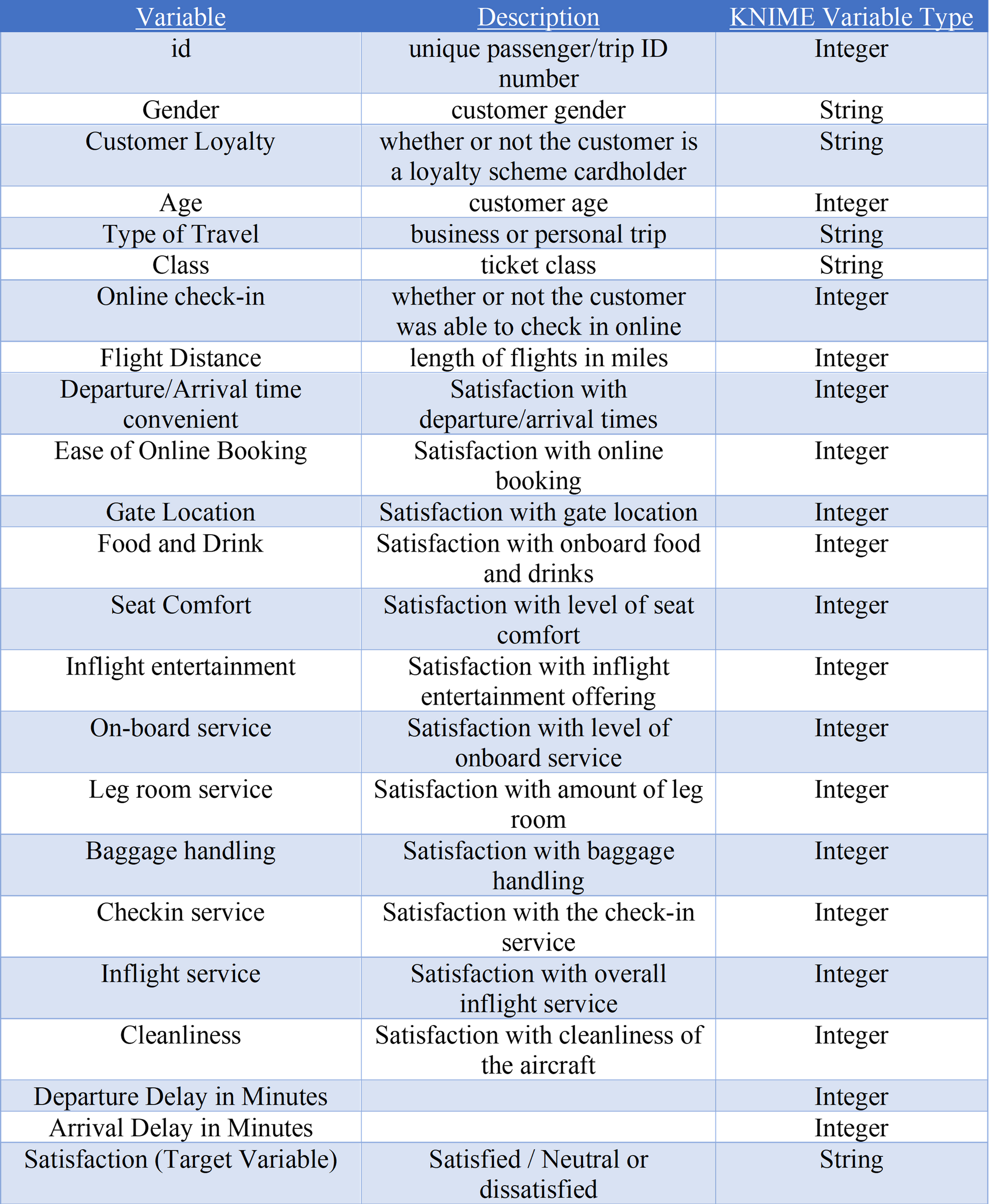 Utilising the Airline Satisfaction Data and the KNIME Analytics Platform. Data exploration will be conducted to ascertain the relevant properties of the data, replace missing values, remove outliers, and remove any collinearity. Then two supervised models (Decision Tress and Naïve Bayes) were trained and then deployed on unseen data to predict the binary class membership of either satisfied/neutral or dissatisfied. Utilising performance measures (Confusion Matrix, Cohens Kappa and ROC Curves) evaluate and compare the different techniques performances and accuracy of there predictions.