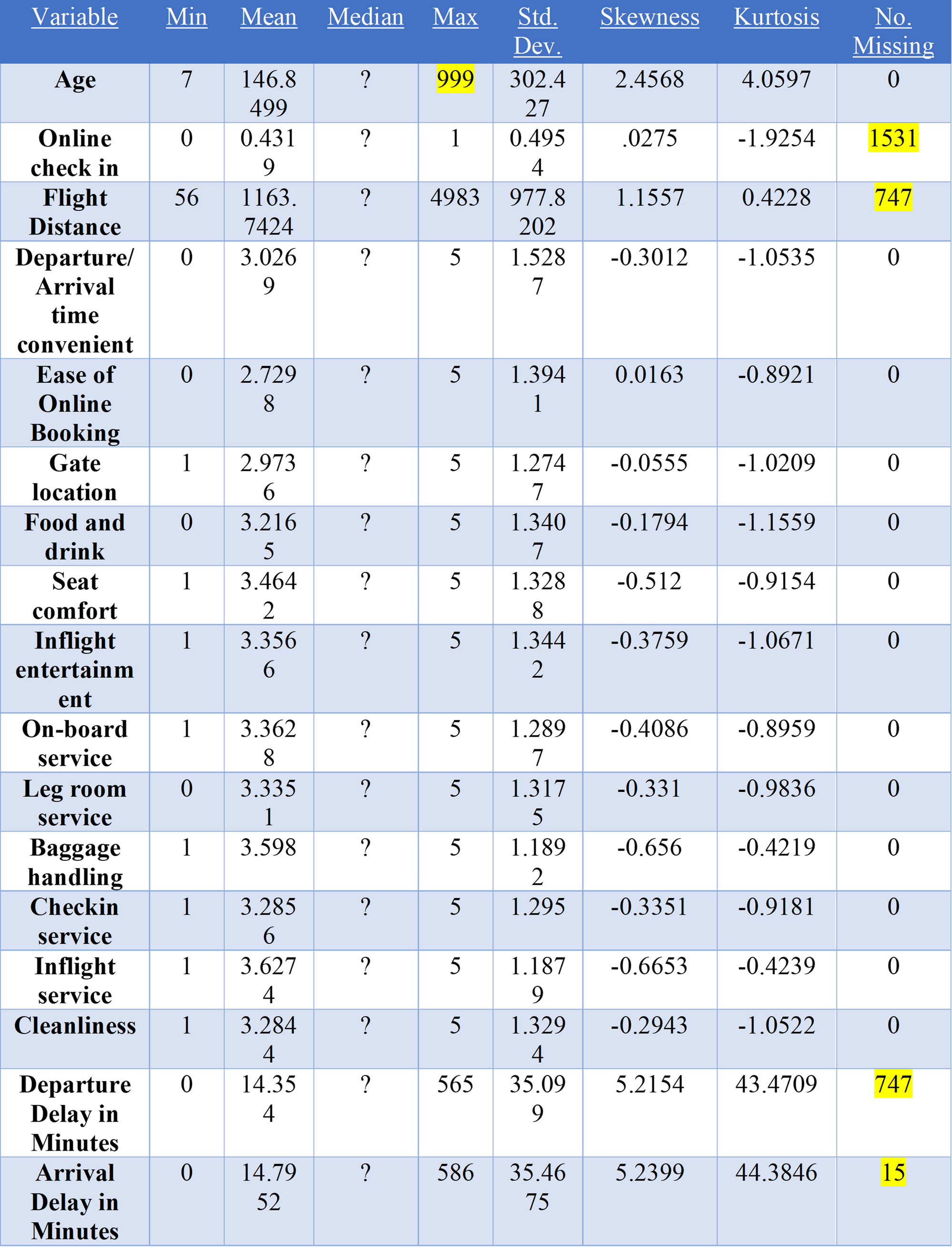 The missing values for flight distance were replaced with the average flight distance of the whole dataset with the missing value node, replacing 747 missing values.