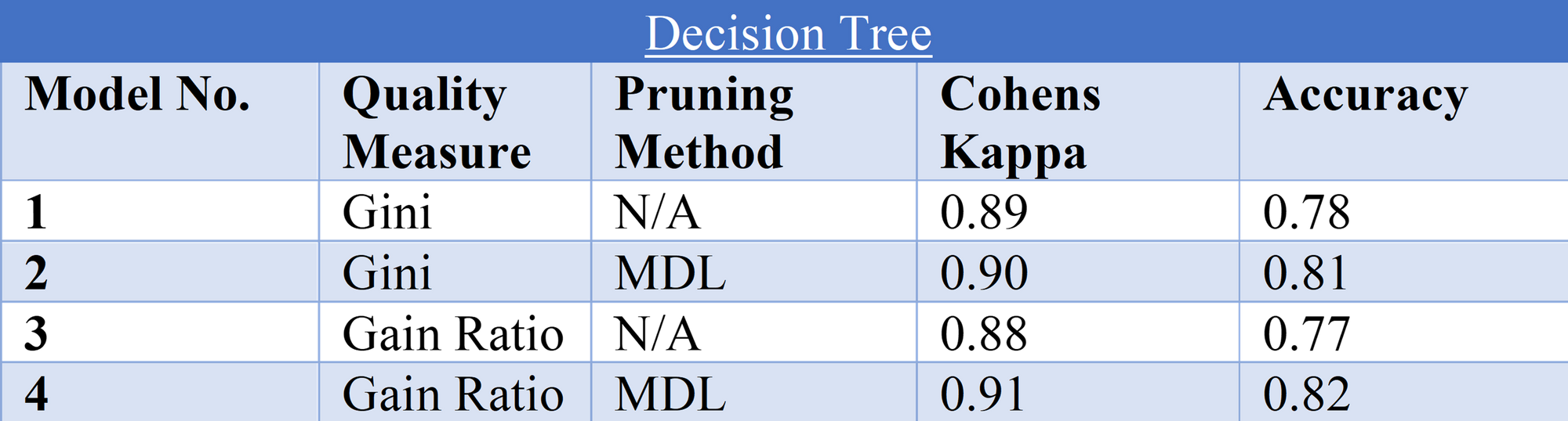 As see in the table Model 4 possessed the highest Cohens Kappa and Accuracy scores, this was applying the gain ratios for splits and applying the MDL pruning method. A confusion matrix for this model was produced below to compare against the naïve bayes classification method.