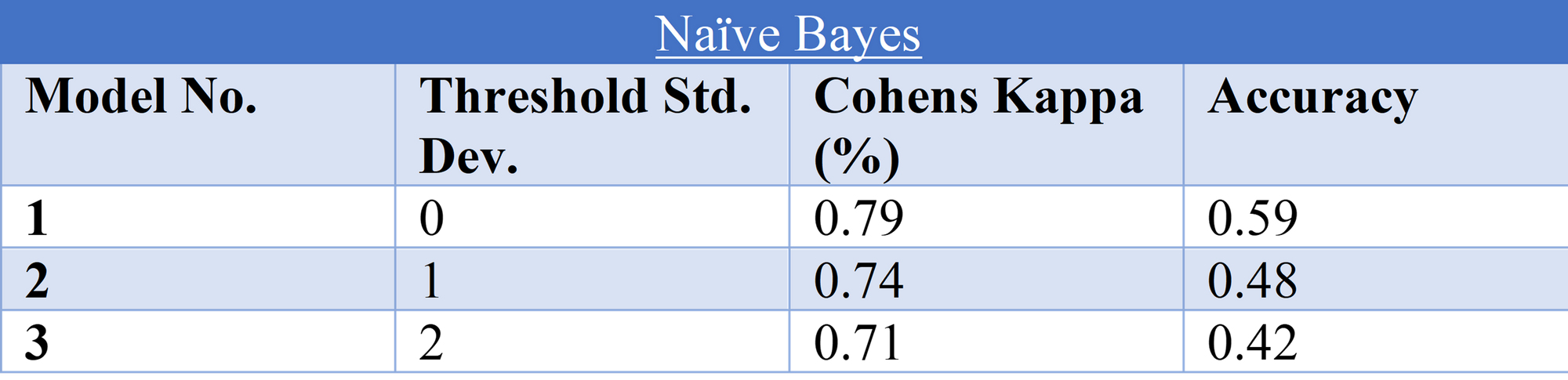 Model 1 possessed the highest evaluation measure scores; it is worth noting that as the threshold standard deviation increased both performance measures decreased. See below for a confusion matrix of the naïve bayes model results.
