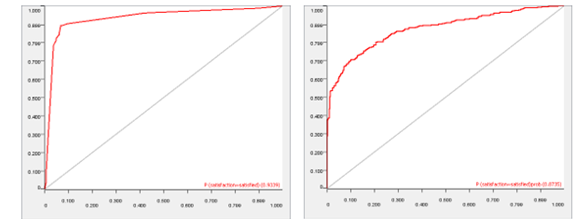 Overall, the Decision Tree Model 4 performed the best on the test data in both evaluation methods 0.91 Cohens Kappa compared to the Naïve Bayes model only achieving 0.71. Also, the decision tree model had highest accuracy of 0.82 whereas the Naïve Bayes model only had 0.59. With accuracy being an intuitive way of measuring performance of a classification model (Banihashemi, Ding, & Wang, 2017) it can be concluded that the decision tree is the more appropriate model. This may be because the assumption of independence with the naïve bayes model may not have been achieved with the correlation filter node of 0.8 however as (Ashari, Paryudi, & Tjoa, 2013) state the naïve bayes algorithm can/should preform without this independence. The ROC curves below show the two respective models performance in terms of AUC where a value of 0 shows a perfectly inaccurate test and a value of 1 reflects a perfectly accurate test (Mandrekar, 2010). Shown below in the ROC curves there is a 93.39% chance that the Decision tree model will accurately classify a customer. Whereas with the naïve bayes model there is only an 87.35% chance of an accurate classification.